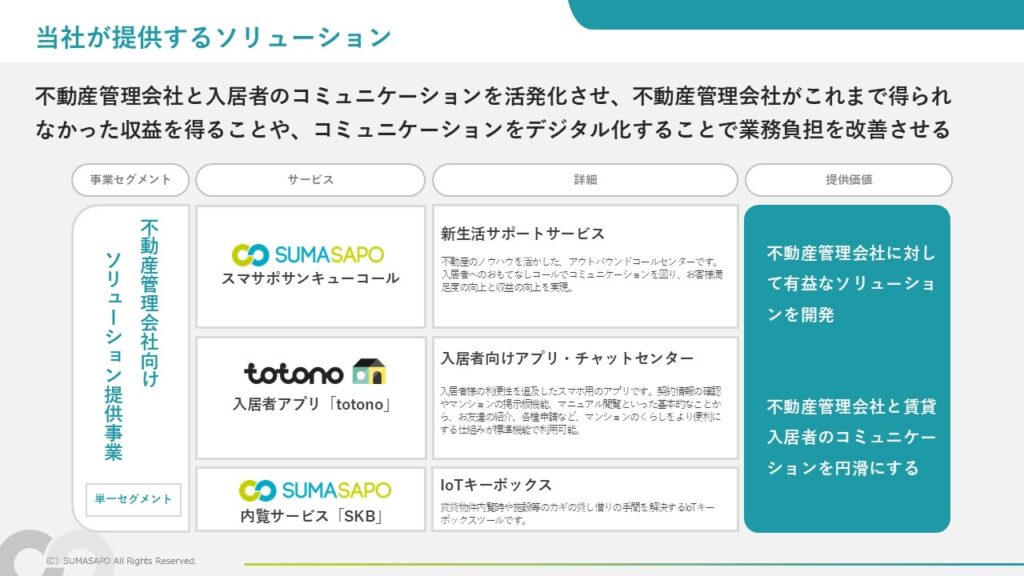 具体的には、スマサポは「スマサポサンキューコール」や入居者アプリ「totono」などのサービスを通じて、不動産管理会社の業務負担を軽減し、入居者との円滑なコミュニケーションを実現しています。これにより、入居者は快適な住環境を享受できると同時に、管理会社は業務効率化と収益向上を図ることができます。