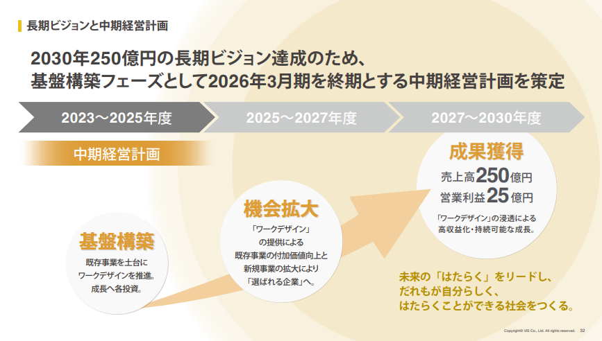 2025年度には、2023年5月に発表した中期経営計画の売上高161億円を上回り、売上高170億円、営業利益19.2億円になる計画をしています。ブランディング事業に関しては、リピート率が高く、売上高では既存クライアントが半数を超えています。さらに2030年度に売上高250億円を目指し、成長を加速させていきます。働く環境や働き方をデザインする『ワークデザイン』の拡大を推進し、『はたらく人々を幸せに。』というパーパスの実現を目指します。これを通じて、社会へ持続的な価値を提供していきます。