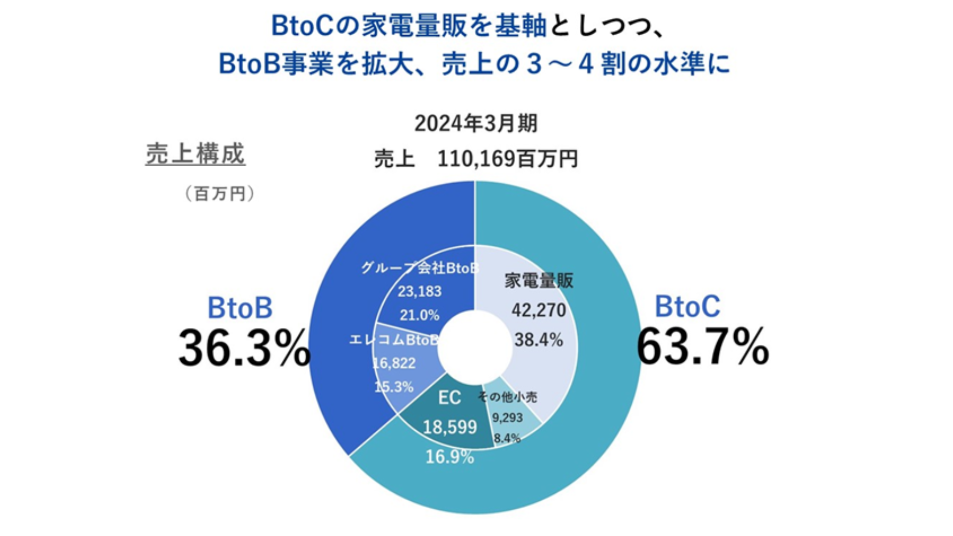 エレコムの販売チャネルはBtoBとBtoCの大きく分けて2つに分類されます。現在の売り上げ比率は、BtoBが30~40%、BtoCが60~70%を占めています。このうちBtoC領域のECサイトでの売り上げは約17%、家電量販店での売り上げは40%程であり、実店舗での販売はもちろん、オンライン販売の強化にも力を入れています。