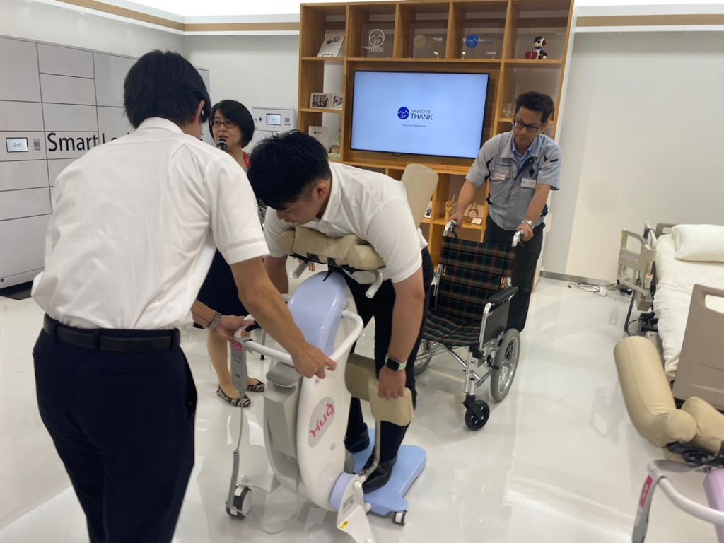 施設・病院介護の現場において、ベッドから車椅子、車椅子からお手洗いといった座位間の移乗動作や、脱衣場での立位保持をサポートするロボットです。