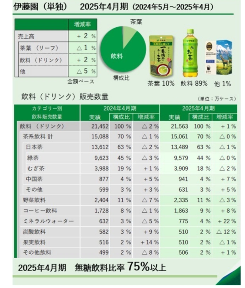 株式会社伊藤園(以後伊藤園)は、「お客様第一主義」を経営理念とする飲料・茶葉製品メーカーです。飲料関連事業が売上全体の約9割を占めており、その中の約7割を茶系飲料が占めています。主力製品は、茶系飲料の「お~いお茶」や「健康ミネラルむぎ茶」、野菜飲料の「1日分の野菜」、さらに「TULLY’S COFFEE」ブランドの飲料など多岐にわたっています。また、タリーズコーヒージャパン株式会社を子会社化しており、飲食関連事業にも力を入れています。健康志向と多様な商品展開を強みに、国内外の市場を拡大しています。