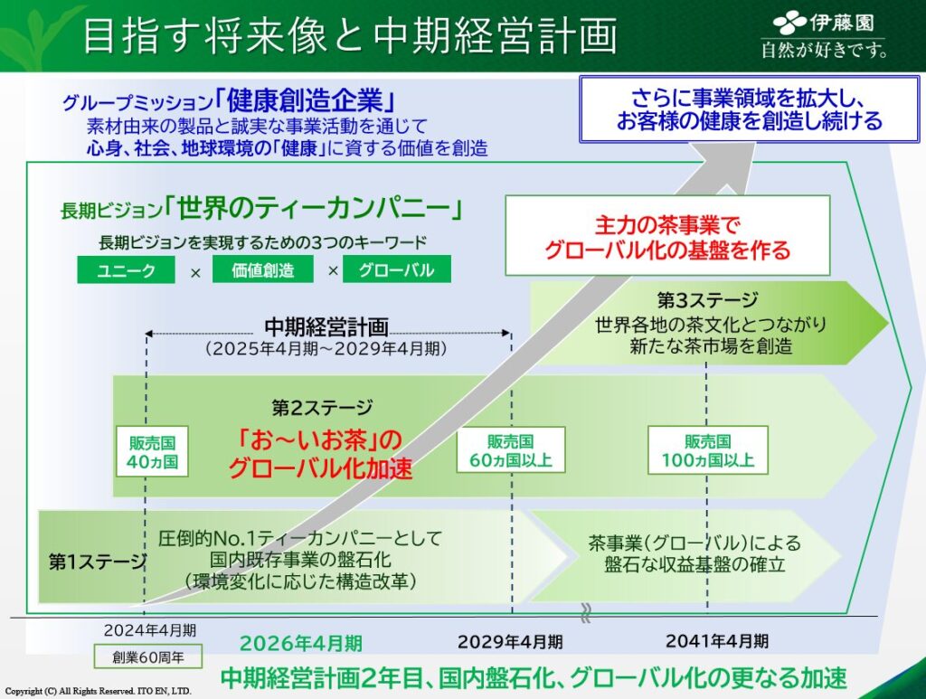 伊藤園は、「世界のティーカンパニー」になることを目標にグローバル展開を加速させています。「お~いお茶」のグローバル化に向けて日本市場での圧倒的シェアを維持しつつ、2029年4月期には世界60か国以上への展開を目指す中期経営計画を推進しています。現在は売上の約9割が日本市場ですが、世界各地のお客様の健康で豊かな生活を創出すべく、海外展開を強化しています。