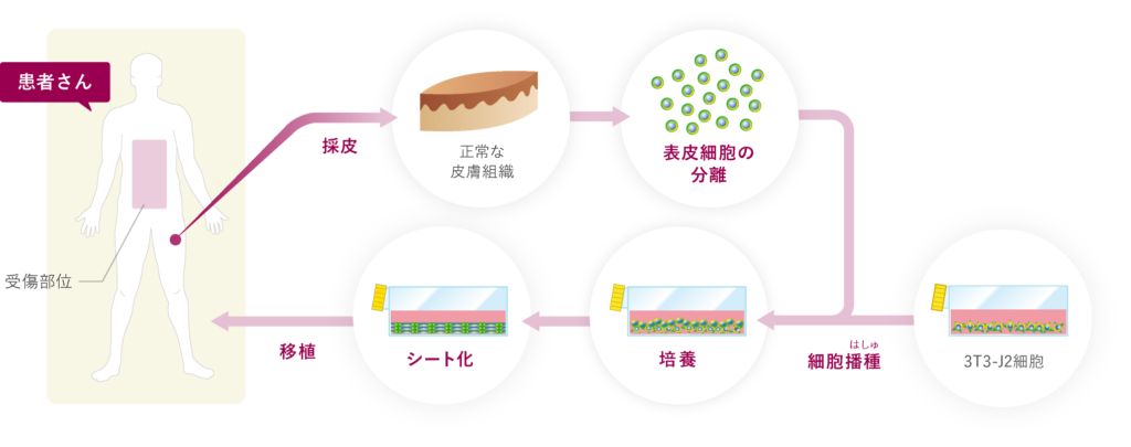 自家培養表皮ジェイスは、大やけど・生まれつきのあざ・少しの衝撃で皮膚がはがれてしまう病気などの治療に使われます。