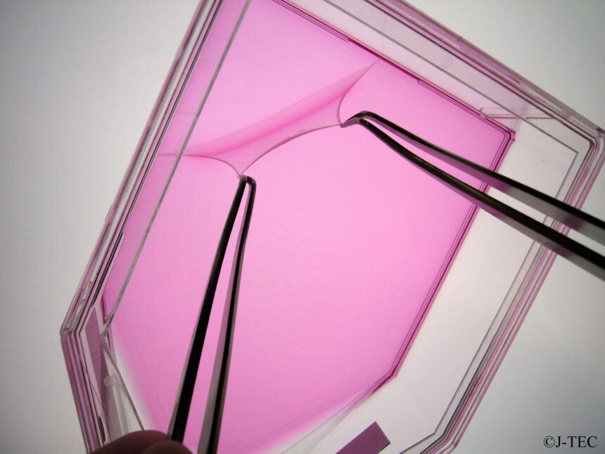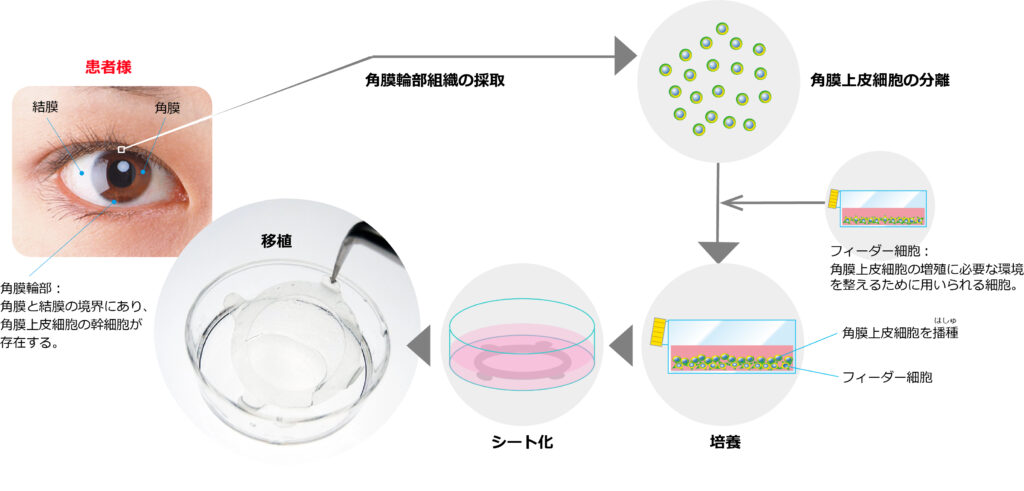 自家培養角膜上皮ネピックは患者さんの眼の角膜の部分を少量いただいてきて、J-TECで細胞を増やしてシート状にしたものです。化学薬品などで片方の黒目が濁ってしまった患者さんの治療に使われます。
