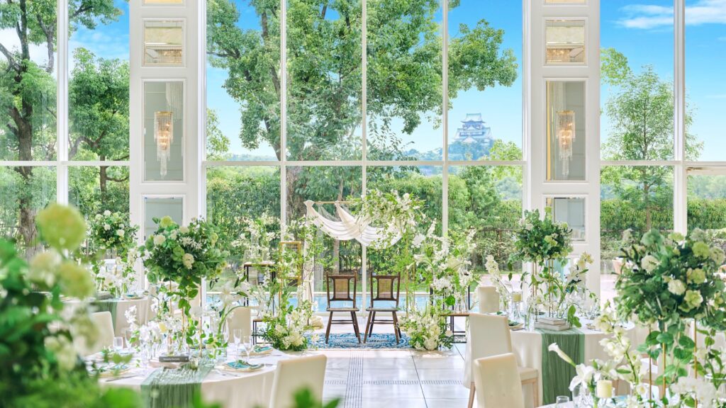 実は、大阪城公園内にもIKKが手掛ける結婚式場があります。特別なロケーションに、都会の便利さと自然の美しさが組み合わさった会場として人気を集めています。年間400組以上の結婚式が行われており、自治体の協力で土地をお手柄な金額で借りられるため、収益率も高くなっています。大都市では「自治体とのコラボ×特別な立地」という戦略でブランドを拡大し、大人数での結婚式も可能に。高稼働と好立地で、お客様にもご満足いただいている、最高のロケーションです。