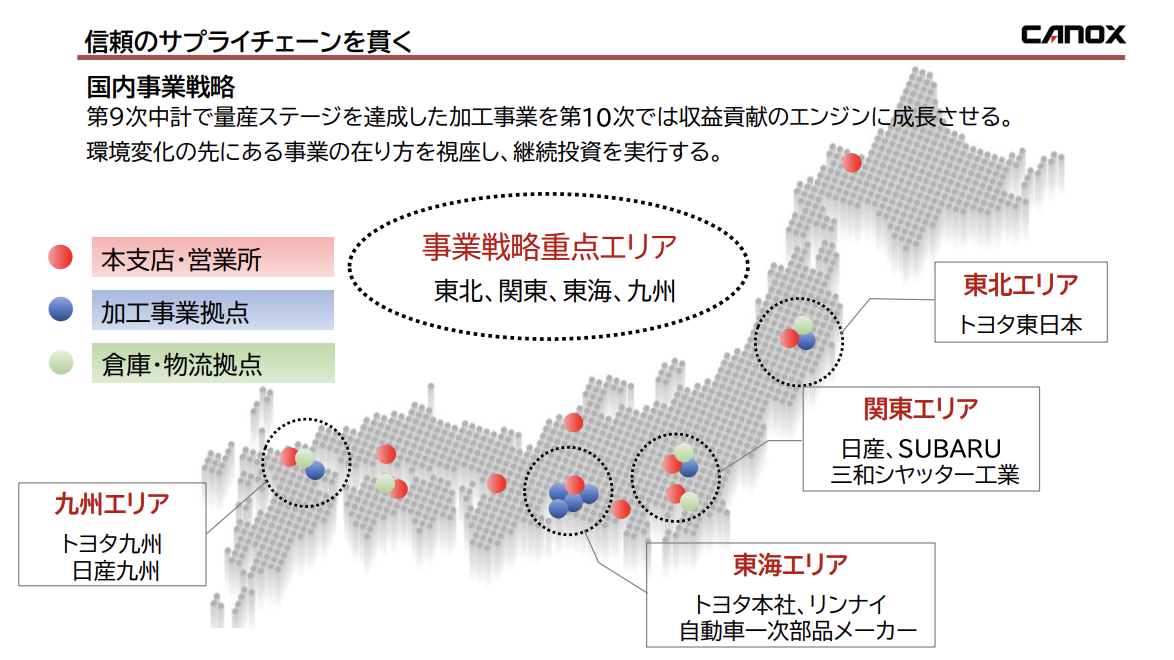 カノークスでは経営資源を国内に重点的に分配しており、国内をすべてつなげる営業網を作り、お客様に合わせた加工拠点を作ることで、国内の地場産業に密着した経営戦略を取っています!