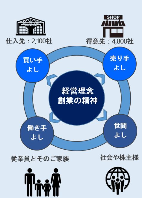 得意先である⼩売店さまや飲食店さま(売り手)、仕入先であるメーカーさま(買い手)、そしてドウシシャ と社員(働き手)、社会全体や株主の皆さま(世間)など「四方」のことを常に考えて⾏動することが、安定した成⻑に繋がると信じています。