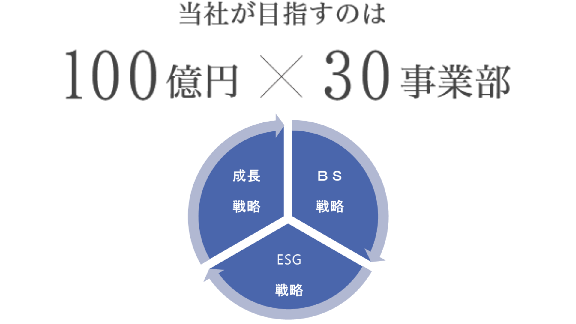 ⼀つ目は、ニッチ市場No.1シェアのさらなる獲得です。現在、ドウシシャでは関連会社を合わせ11の事業部がありますが、⻑期ビジョンとして事業部を30まで拡⼤させ、1つの事業部の売上を100億円まで成⻑させ「100億円 30事業部構想」という目標に取り組んでいます。