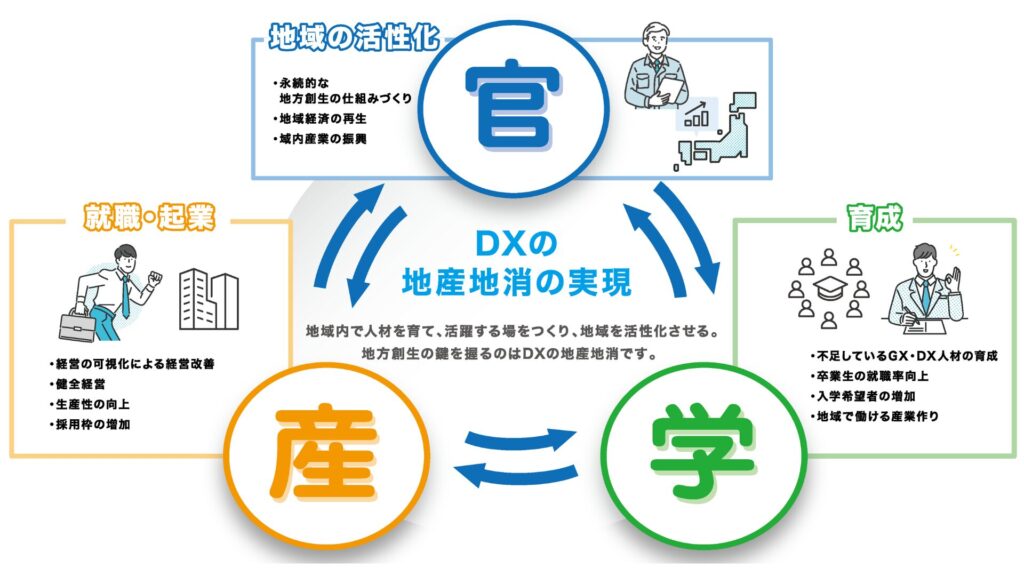 F-Japan構想」は、(民間企業)、(自治体)、(教育機関)の連携を通じて、DX人材を育成し、その人材が地元経済を活性化させることを目指す取り組みです。大学と連携してDXや経営の講座を開き、企業を支える「企業ドクター」を育成しています。成長したドクターが地元企業の治療を行うことで地方創生を目指しています。