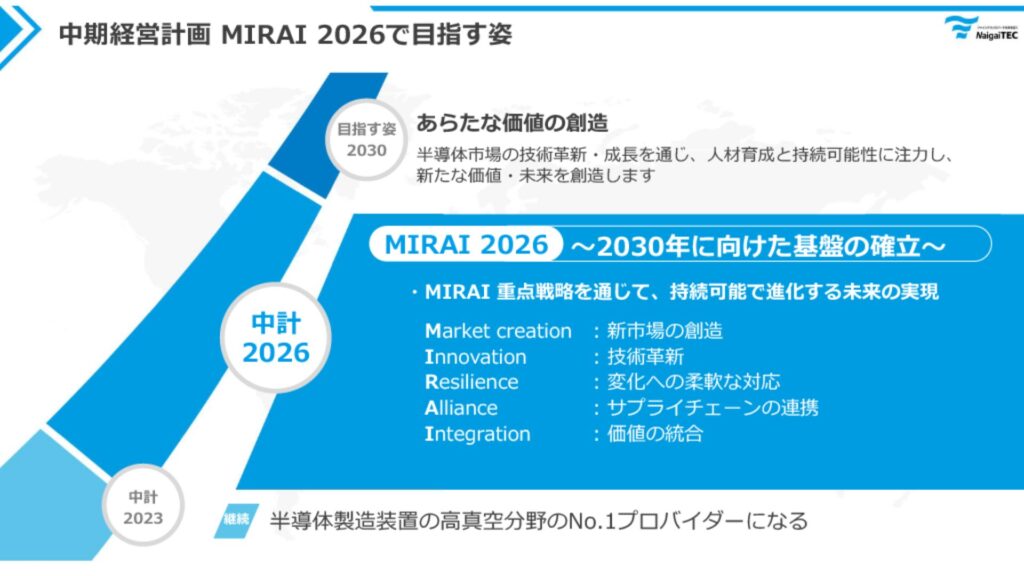 内外テックは、未来を見据えた中期経営計画「MIRAI 2026」を推進しています。この戦略では、「MIRAI」の頭文字を取り、「Market Creation(新市場の創造)」「Innovation(技術革新)」「Resilience(変化への柔軟な対応)」「Alliance(サプライチェーンの連携)」「Integration(価値の統合)」の5つの柱を掲げています。これにより、2030年を目標とした新たな変貌を目指しています。