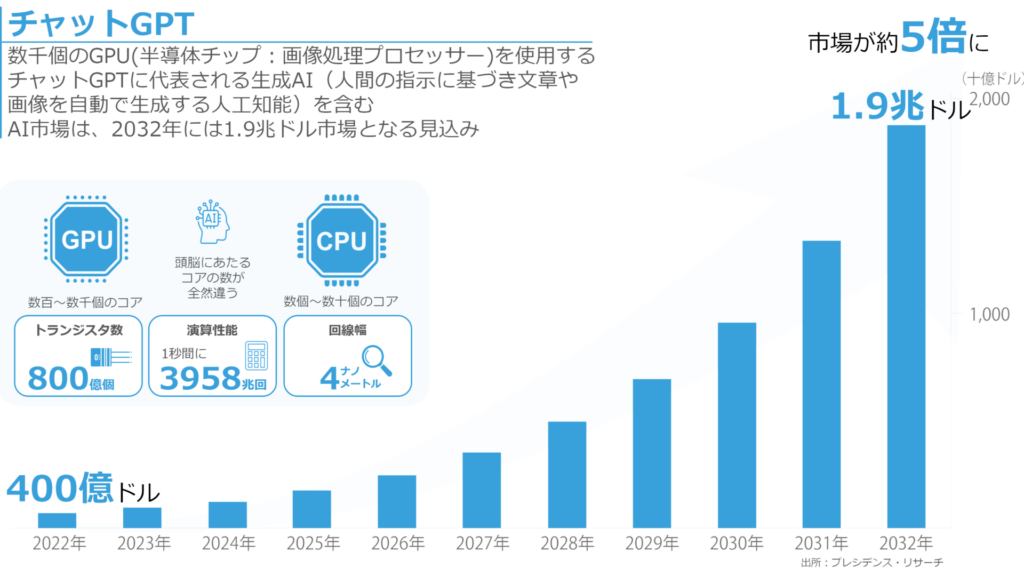 現在、半導体は国の経済安全保障政策の中核として注目され、国内外での投資が増加しています。情報量の爆発的な増加により、AI市場は加速度的に成長しています。2032年には現在の約5倍。1.9兆ドルになると予想されています。