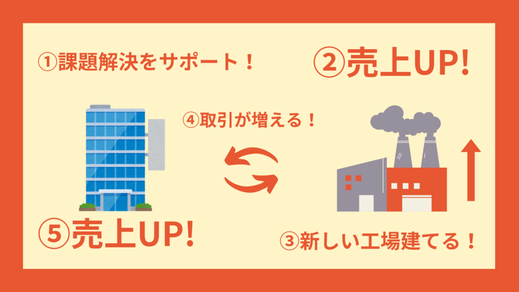 日伝はルートセールスを大切にしています。開拓営業も行いますが、飛び込み営業はしません。では、どの様に売り上げを伸ばしているのか。それは、1番はお客さんに成長してもらうことです!売り上げが上がると、得た利益を新商品開発に使うことができます。そうして新しい工場が建てば、その工場との取引が始まり、日伝の売り上げに繋がります。日伝はお客さんの成長をサポートするため、日々課題解決策を提案しています。