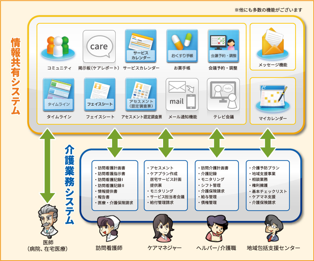 介護者の情報をクラウド上に保存することで、セキュリティに守られた中で実際にケアをしている医療介護従事者が患者の医療・介護情報にアクセスすることが出来ます。またクラウドサービスを地域全体で導入することで、地域全体での医療・介護・福祉の情報共有が円滑になります。さらに法人・事務所などが介護業務システムを導入することで情報共有システムにデータを自動連動し、ペーパーレス化、業務効率の向上が促進されます。