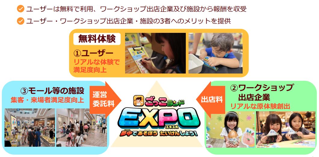 ごっこランドEXPO(リアル版ごっこランド)は、リアルな体験イベントとして全国のショッピングモールなどでイベントを展開しています。アプリとの連動で子どもの学びと親の安心感を両立し、施設と企業双方にメリットがあるモデルなんです。