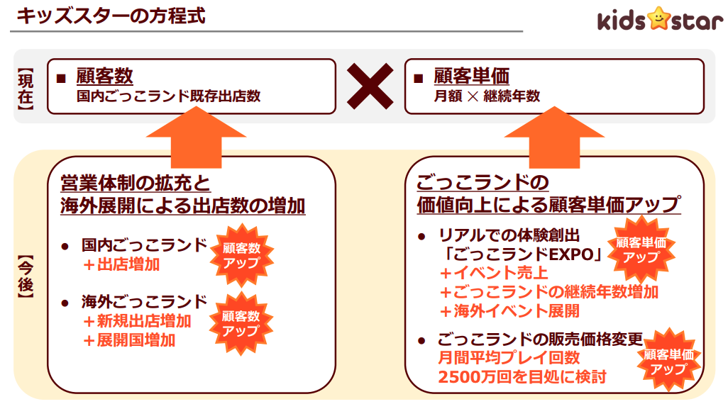 キッズスターは海外展開だけでなく、ごっこランドの価値向上に伴った出店店舗数の更なる飛躍や出店単価を上げること、プレイヤーの年齢層を広くするなどを計画しています。