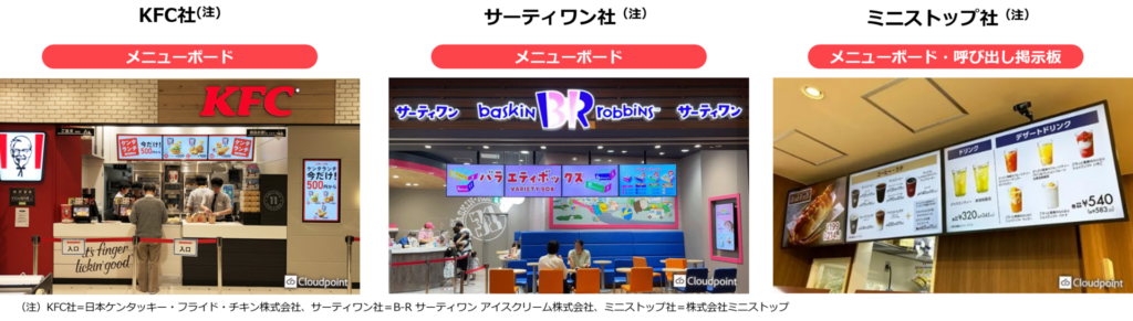 デジタルサイネージ関連事業を展開する(株)クラウドポイントでは、店舗や商業施設などで販促や情報提供のために利用されるデジタルサイネージ(電子的な表示機器)の機種選定から施工、保守まで一気通貫で実施。動画や、アニメーションを活用した動く広告や、リアルタイムのお得な情報を映し出すことで、お客様の目を引きつけます。これによりお客様はお得な買い物を楽しみ、お店はリピーターを増やし、売り上げを大きく伸ばすことができるサービスです。