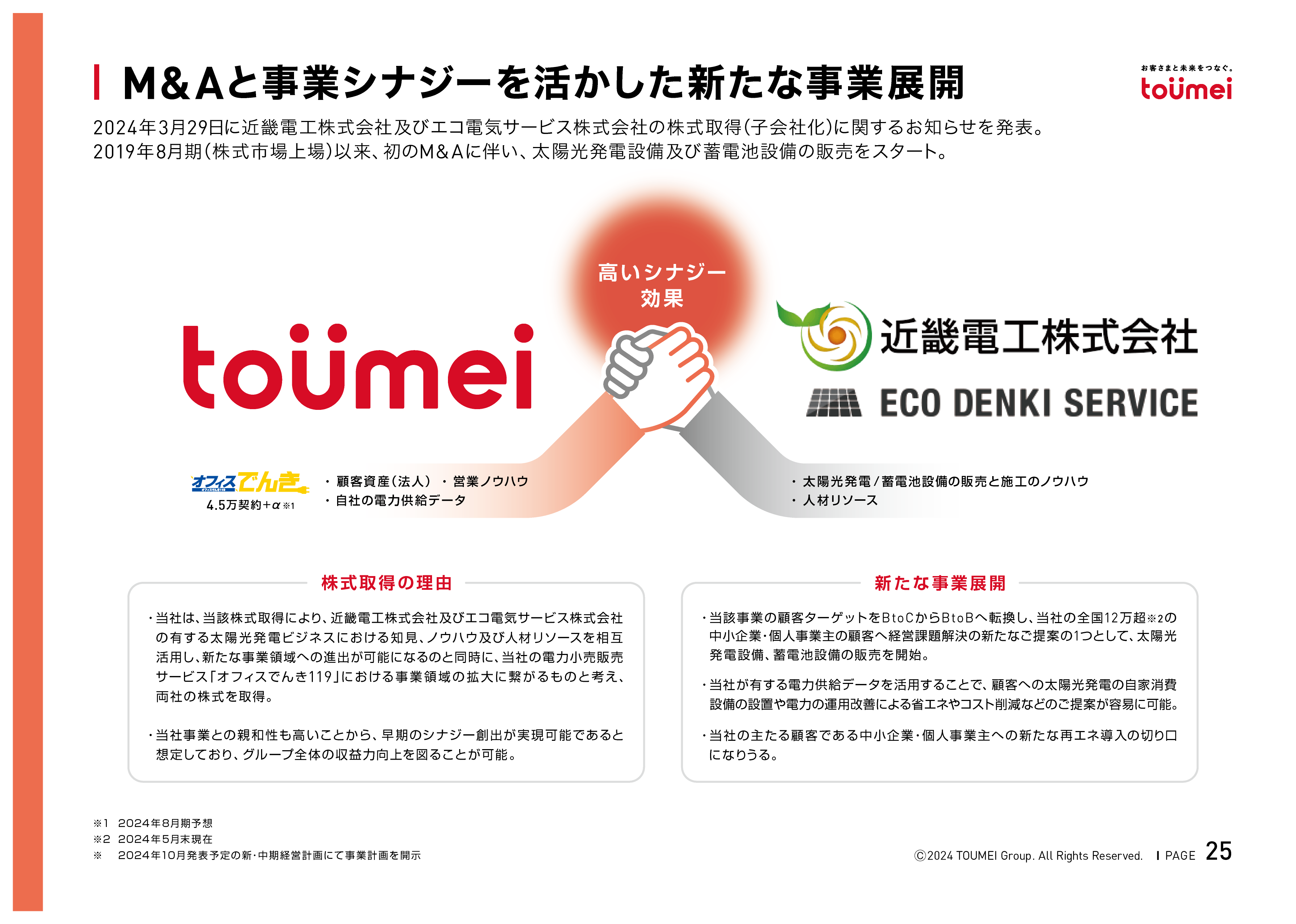 例えば、太陽光発電に関連する会社とM&Aをし、それに関するノウハウを蓄積してお客様に提供するなど、お客様のニーズとしてあるものにはM&Aをしています!