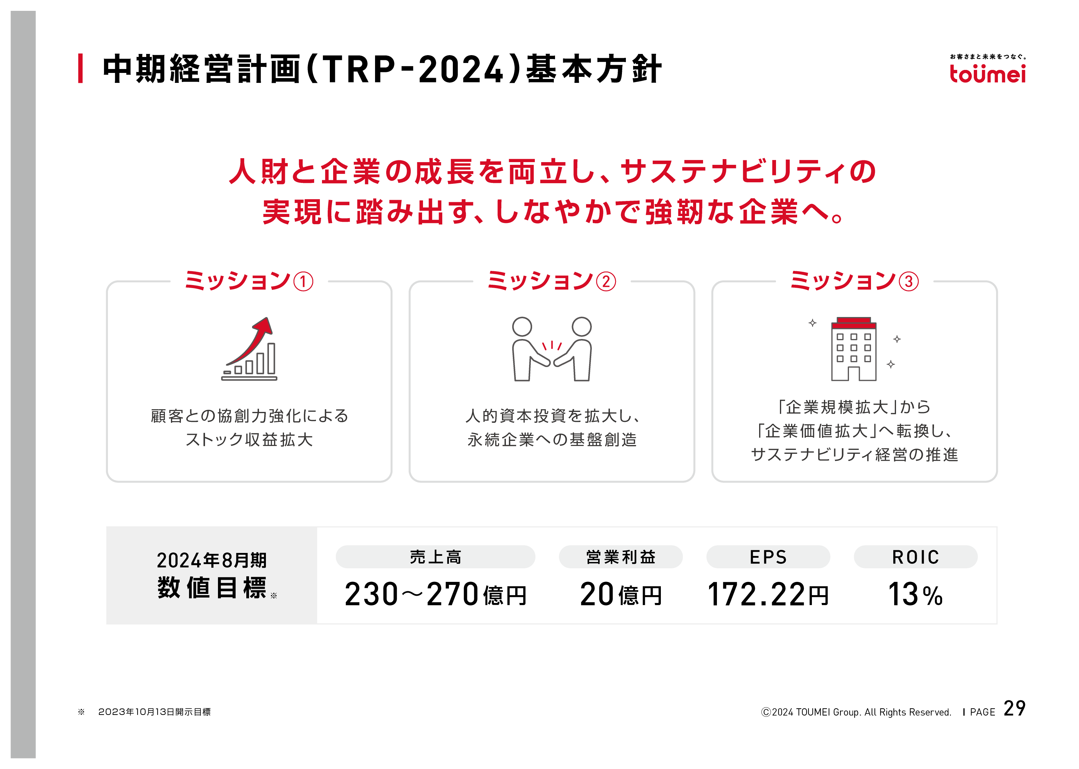 東名では中期経営計画に、「企業規模拡大から企業価値拡大を目指す」と掲げています!10月には新規中期経営計画も発表予定です。