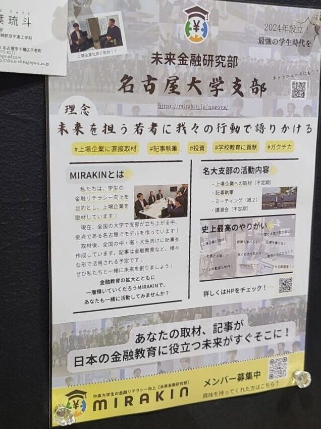 ミラキンの取材を通して視野が広がるにつれ、社会には大学生がまだまだ知らないことが多すぎると感じました。この知れば知るほど面白い社会を自分の周りから伝えていきたいと思い立ち上げました!これから増えていく他大学支部とは仲良く、そして競い合えるような関係を築き、どこよりも士気の高いかっこいい名大支部でありたいと思っています!かっこいい名大支部を僕たちと一緒に作り上げてくれる方、ぜひ一度ご連絡ください!✨